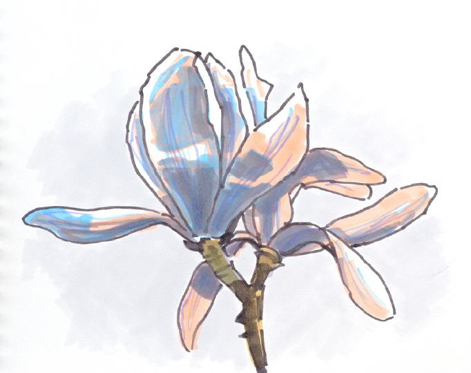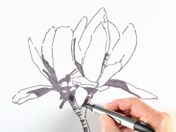 Wenn ich unterwegs bin, kann ich mit ihnen so gut wie alles skizzieren und schnell meine Eindrücke festhalten, so wie hier bei einem Besuch in Baden-Baden, als gerade die Magnolien blühten. An jeder Straßenecke sprangen sie einem ins Auge – und dann natürlich aufs Papier! Dabei reichten vier Farbtöne aus, um sie flüchtig einzufangen. Das möchte ich euch am Beispiel einer Blüte zeigen. Eine spannende Sache und ganz einfach.